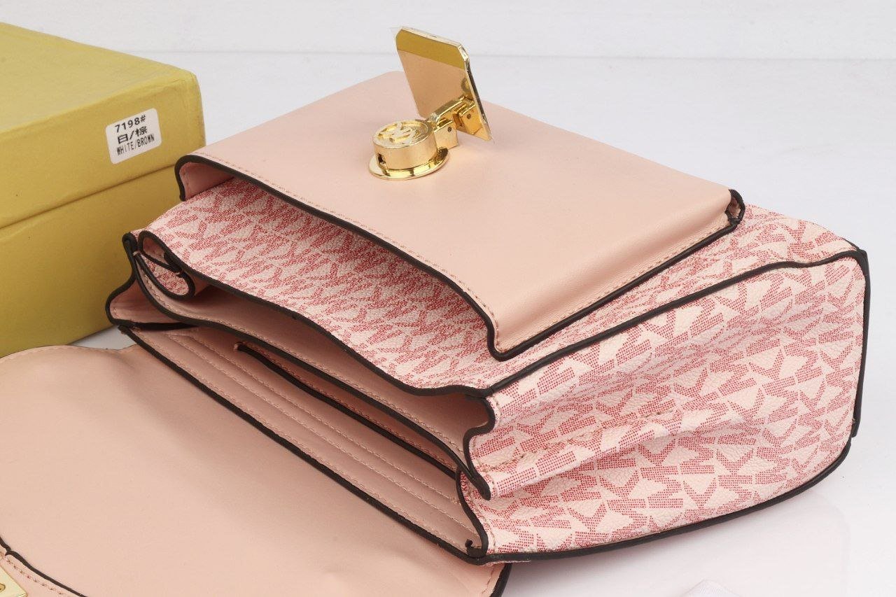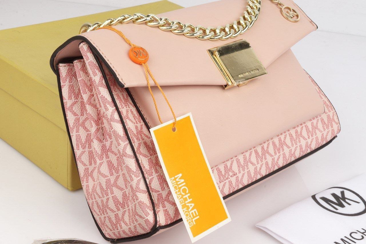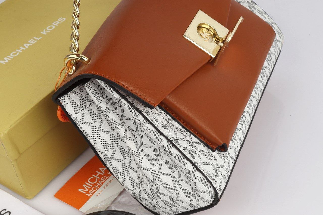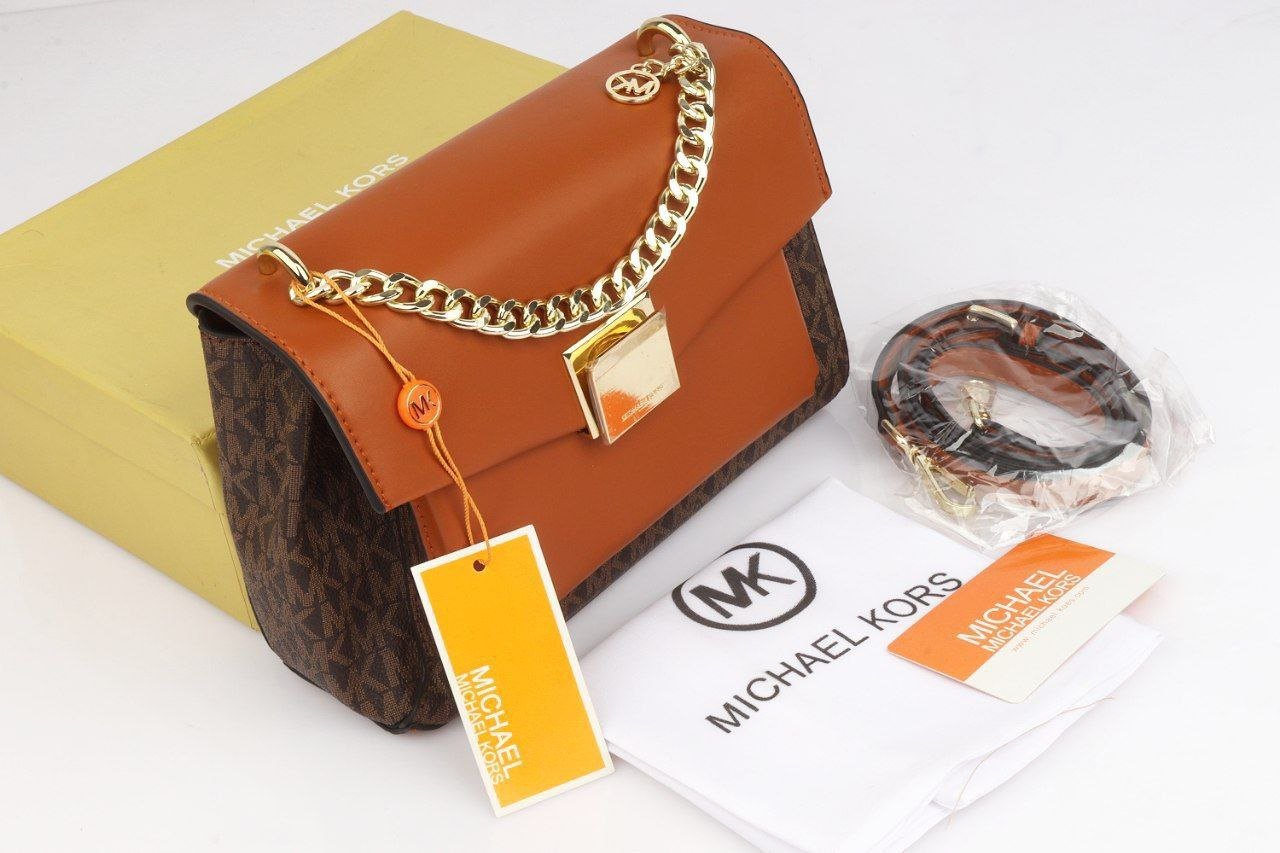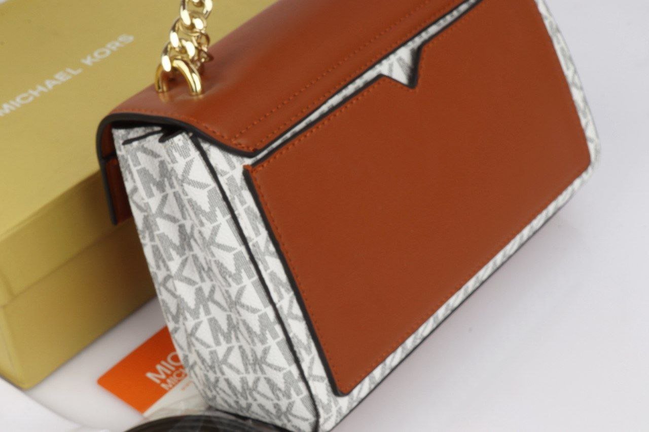 This elegant Michael Kors handbag features a premium leather front flap paired with the iconic MK monogram sides, creating a stylish and timeless design. The gold-tone chain detail and signature MK charm add a luxurious touch, while the structured silhouette keeps it classy and practical.