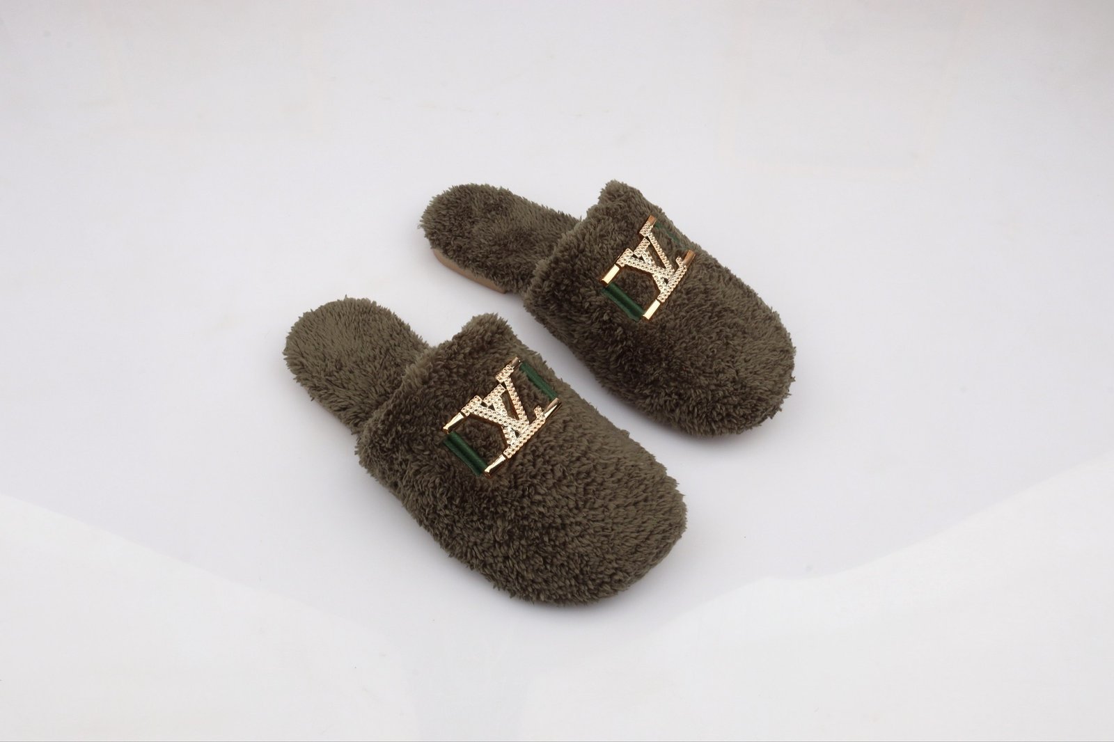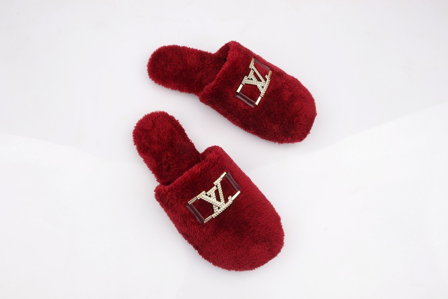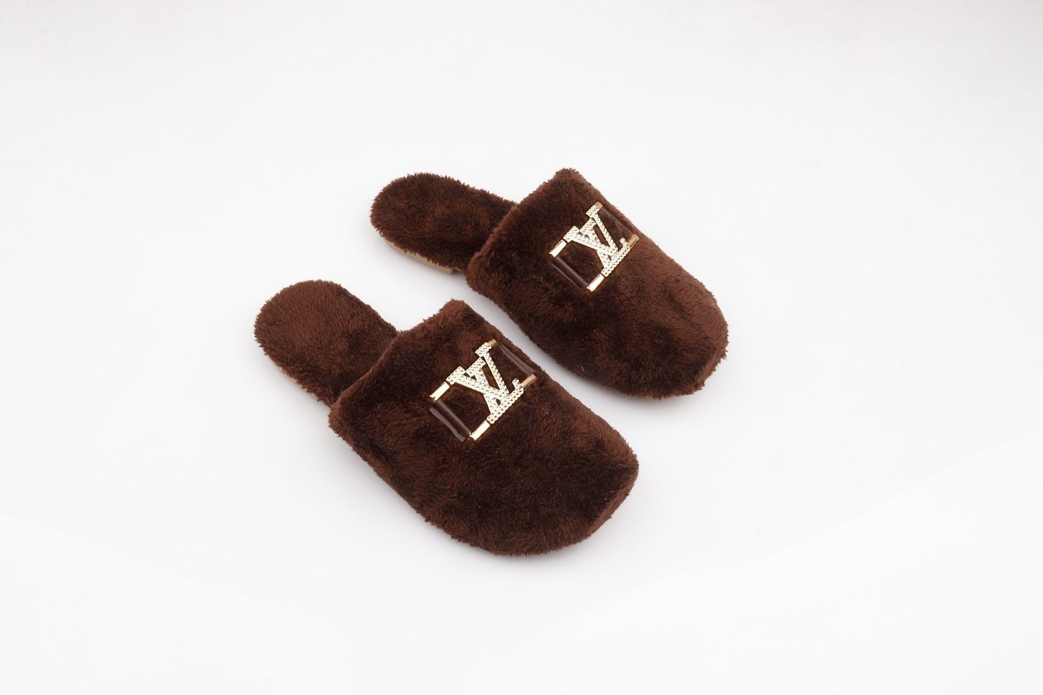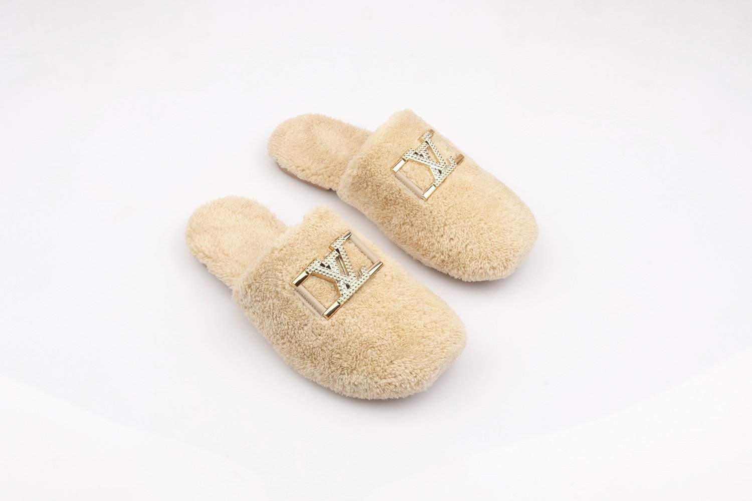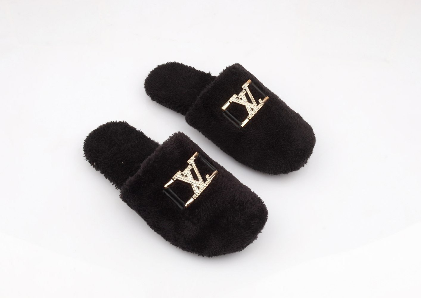 Stay warm and stylish with these ultra-soft faux-fur slippers. Designed with a plush, fluffy texture that keeps your feet snug during colder days. The fit is true-to-size, offering comfortable and secure wear for daily use. Finished with a premium metallic emblem for an elegant touch.